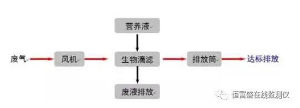 工藝流程以生物氧化為主、化學吸收為輔,主要通過生物處理去除廢氣中的絕大部分污染物,化學吸收單元則可在進氣濃度發生異常時,為系統的穩定達標排放提供進一步保證。主體技術生物滴濾箱由濾床、營養液循環噴淋系統、參數控制系統等組成。廢氣進入生物箱體后,通過附著在填料上的微生物的代謝作用,廢氣中的污染物被降解為簡單的無機物。其中,VOCs分解為CO2、H2O以及其他簡單的無機物;含氮污染物中的氮元素轉化為硝酸鹽或氮氣;含硫惡臭污染物中的硫元素轉化為硫酸鹽。