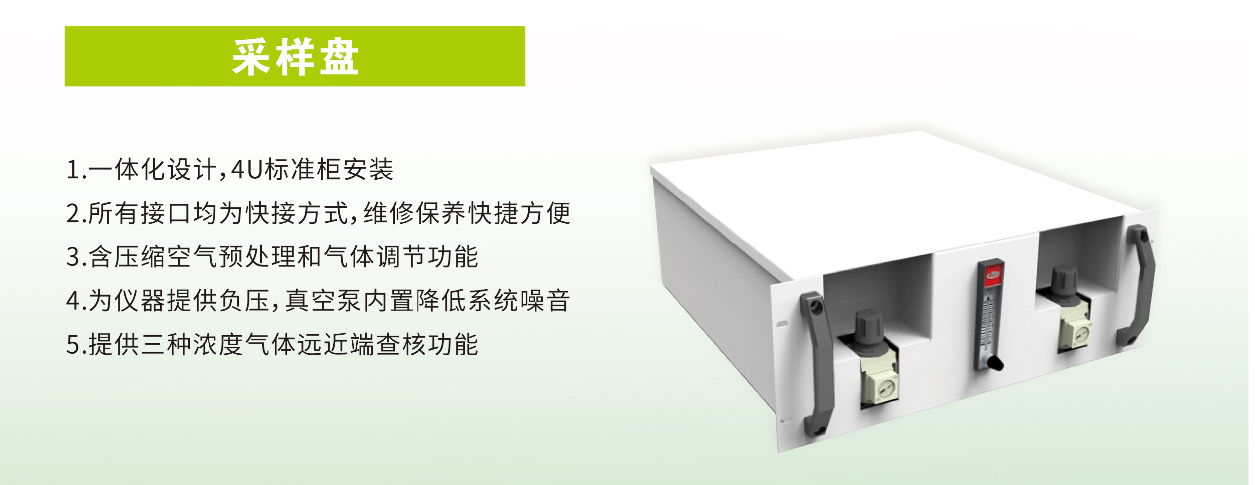 一體化設(shè)計(jì),4U標(biāo)準(zhǔn)柜安裝;所有接口為快接方式,維修保養(yǎng)快捷方便;含壓縮空氣預(yù)處理和氣體調(diào)節(jié)功能;為儀器提供負(fù)壓,真空泵內(nèi)置降低系統(tǒng)噪音;提供三種濃度氣體遠(yuǎn)近端核查功能。